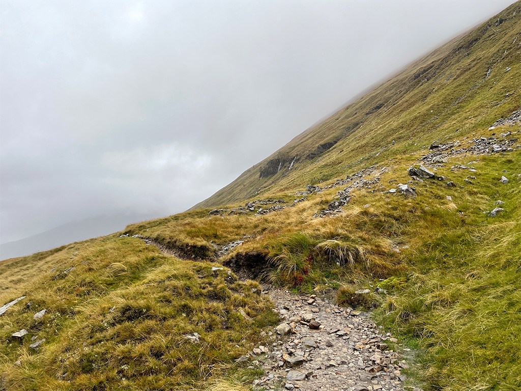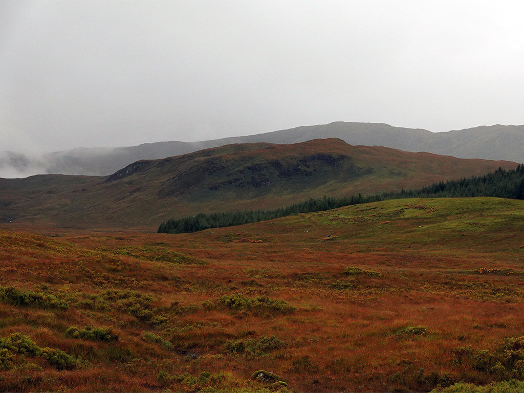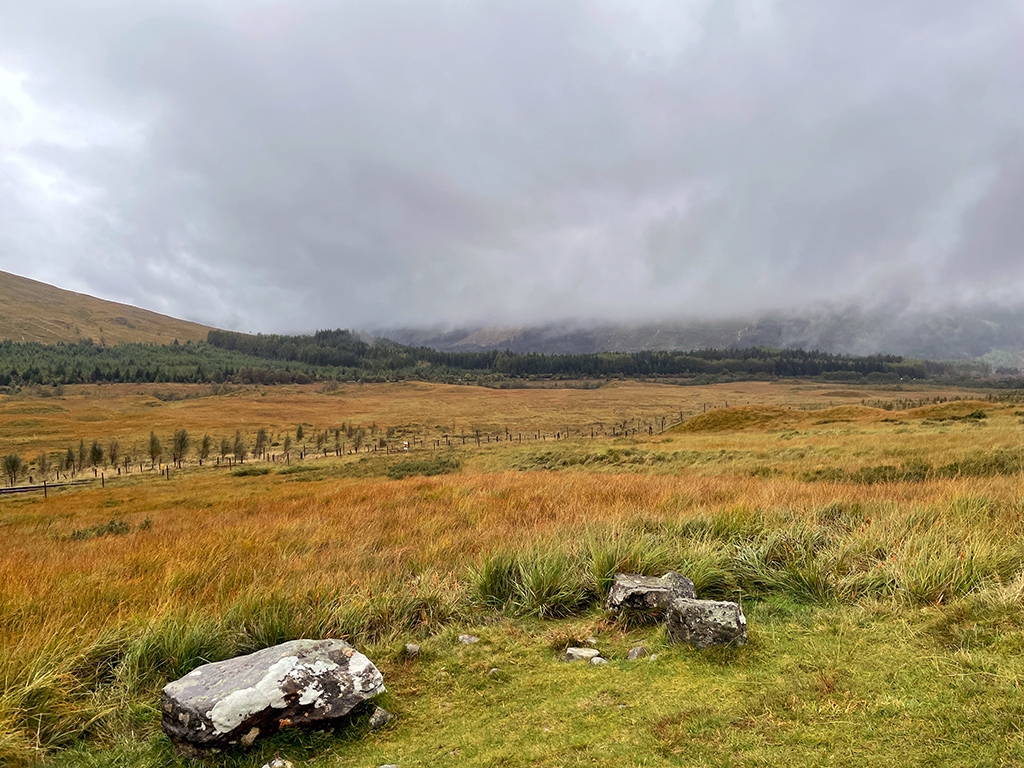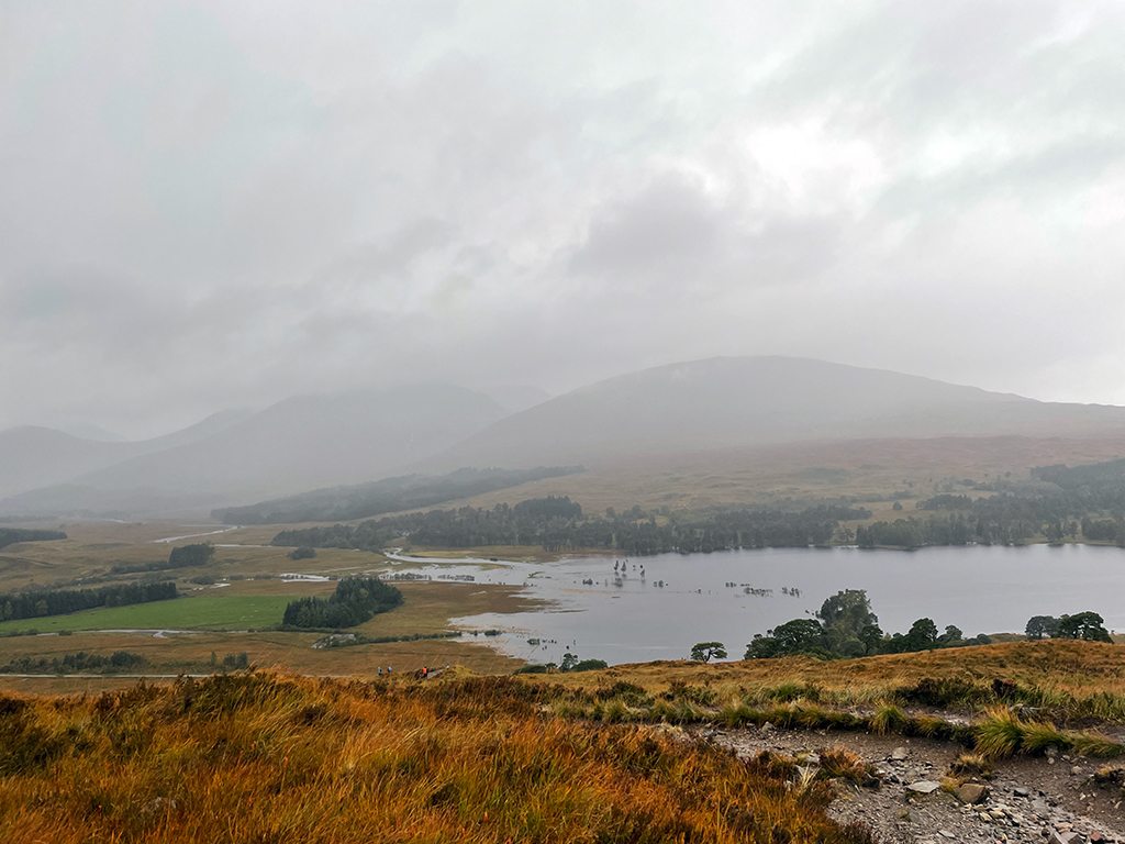 Die Landschaft? Nun ja, ich sehe nicht viel. Dunst, Nebel, Wolken, Regen. Irgendwo dahinter verstecken sich die Highlands und Berge wie der Beinn Bhreac-liath und der Beinn Dorain. Angeblich befinde ich mich in einer wunderschönen Bergschlucht, schreibt mein Wanderführer. Diese kann ich nur erahnen. Die in Dunst gehüllte Szenerie ist aber auch recht reizvoll und nun ja, es kann ja schließlich nicht jeden Tag gutes Wetter sein. ;-)