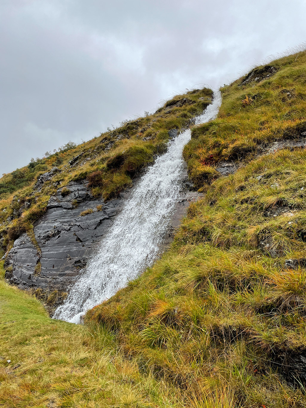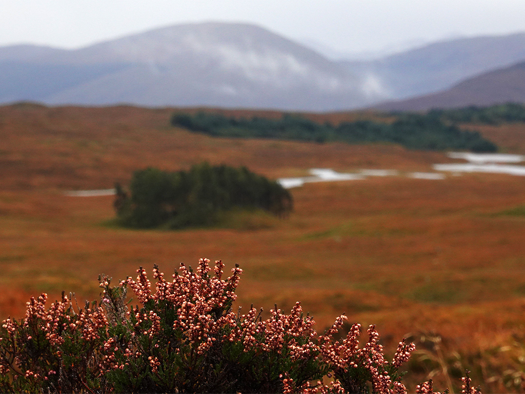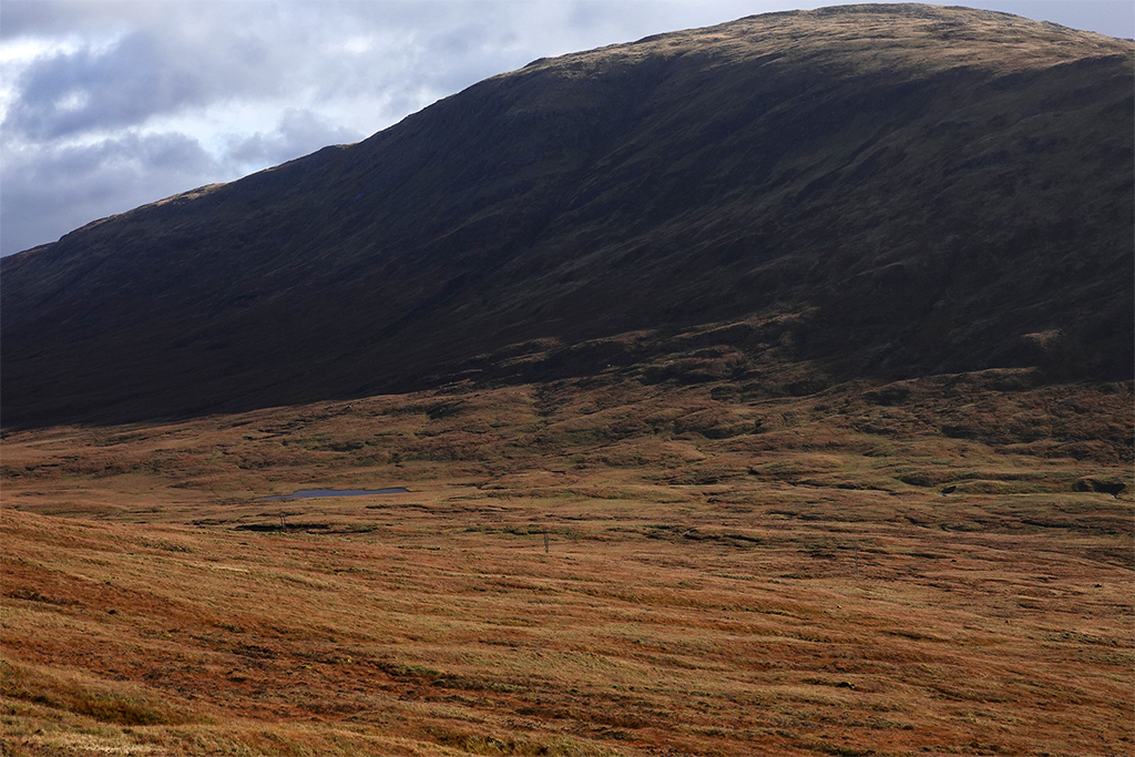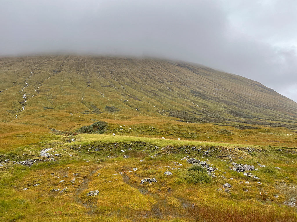 Die Landschaft? Nun ja, ich sehe nicht viel. Dunst, Nebel, Wolken, Regen. Irgendwo dahinter verstecken sich die Highlands und Berge wie der Beinn Bhreac-liath und der Beinn Dorain. Angeblich befinde ich mich in einer wunderschönen Bergschlucht, schreibt mein Wanderführer. Diese kann ich nur erahnen. Die in Dunst gehüllte Szenerie ist aber auch recht reizvoll und nun ja, es kann ja schließlich nicht jeden Tag gutes Wetter sein. ;-)