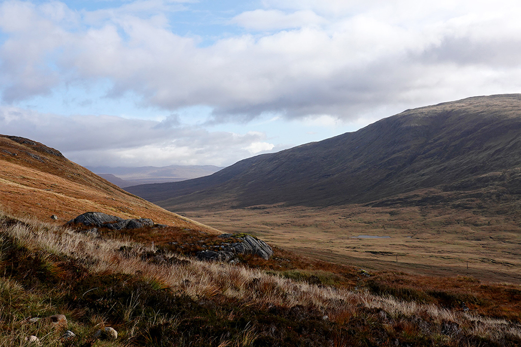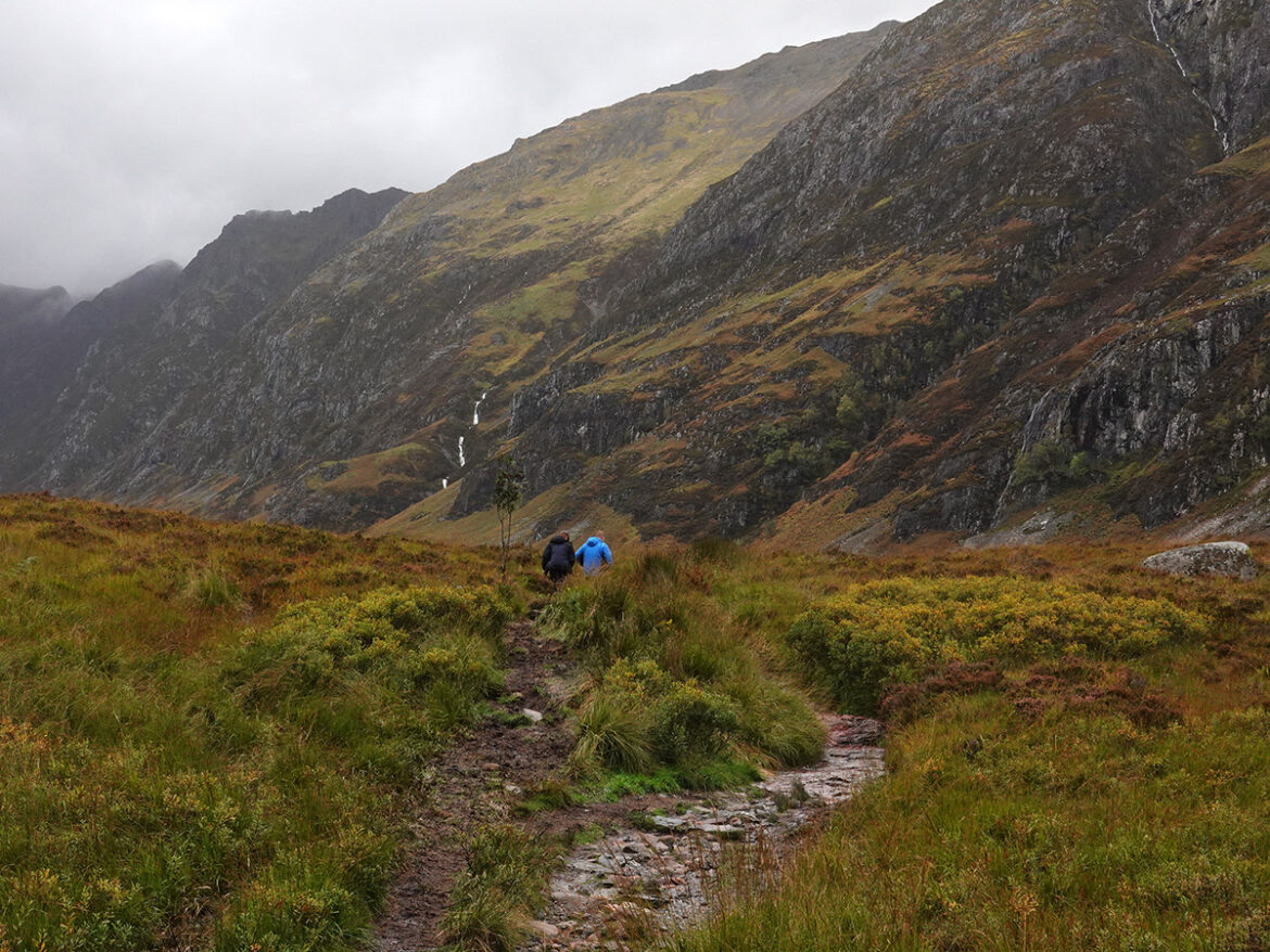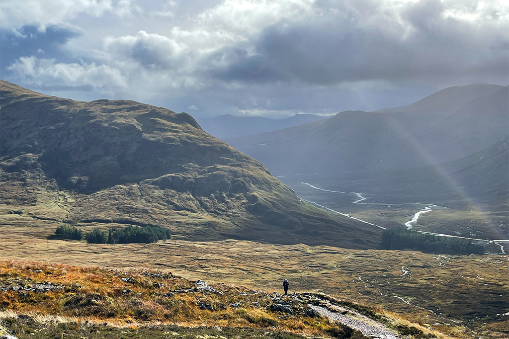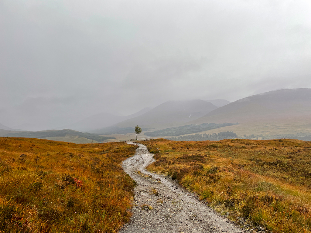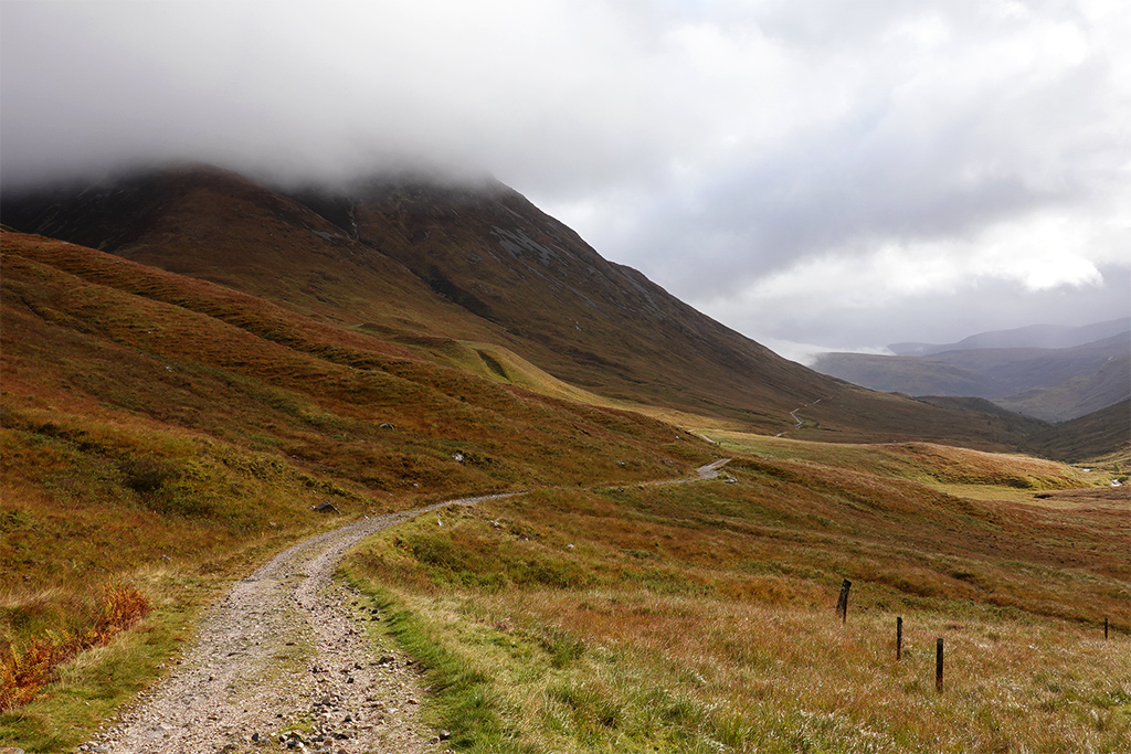 Nach einem kurzen, steilen Anstieg durch die Wälder Kinlochlevens öffnet sich die Landschaft wieder und man ist zurück in den Highlands. Auf den Anhöhen der schottischen Hügel stehend, kann man bereits den, sich durch das Tal schlängelnden, unendliche scheinenden Weg, mit den Augen nachgehen. Die Beine folgen.