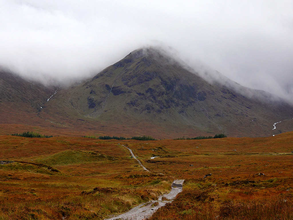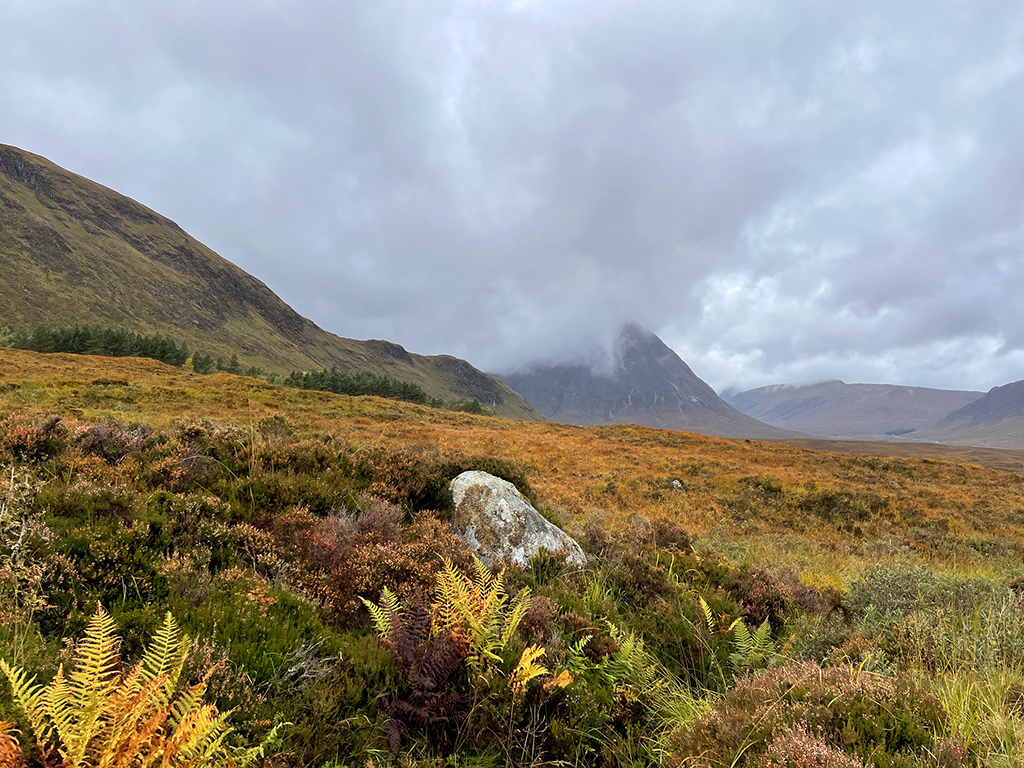 Die Etappe bietet aber schottische Landschaft wie aus einem Märchenbuch. Rot, Orange, Ocker, Rosa, Tannengrün, Olivgrün, Blaugrün und fast Lila. Der Blick auf Buachaille Etive Mòr wird frei, ein pyramidenförmiger Berg mit bisschen Wolke oben drauf. Spektakulär! Ich liebe dramatische Landschaft und bin zwar sehr hungrig, aber total aus dem Häuschen.