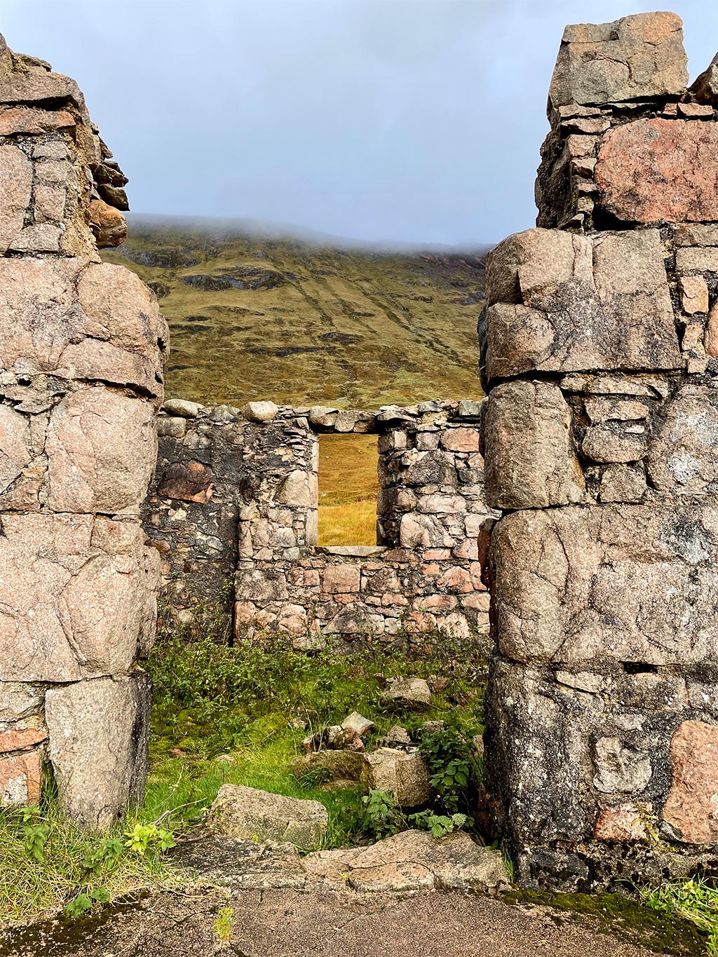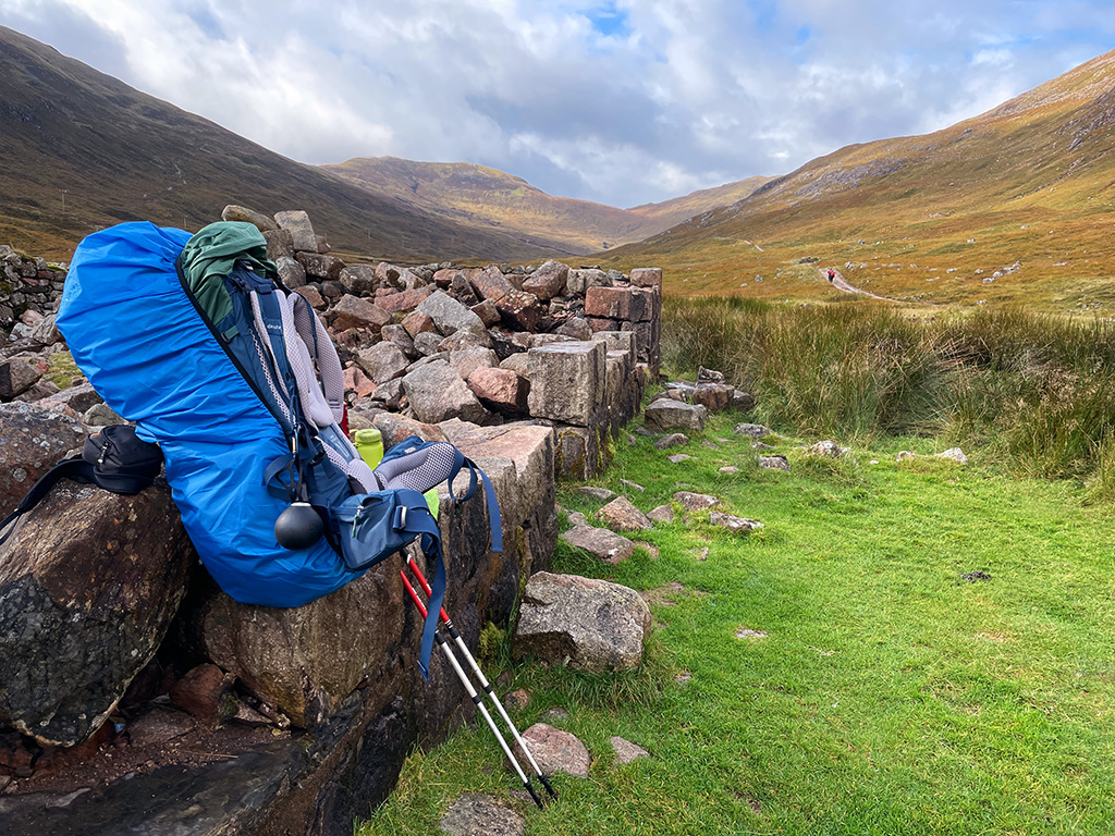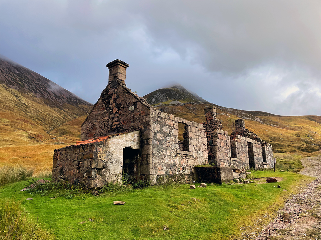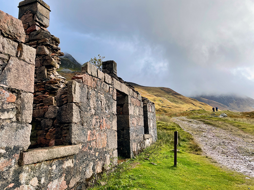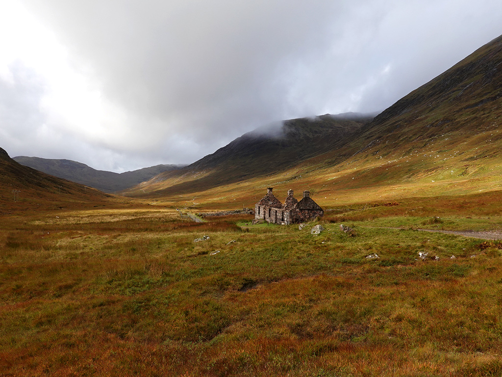 Irgendwo im Nirgendwo passiert man die Ruine der Farm Tigh-na-sleubhaich, die sich wundervoll pittoresk in die Landschaft einfügt. Schön. Hier futtere ich meine Snacks, genieße die Sonne und lege mal kurz die Beine hoch. Der perfekte Platz für eine Pause und schon jetzt eine der schönsten Etappen des gesamten West Highland Ways. Die dicken, grauen Wolken am Horizont lassen mich dann aber vorsichtshalber wieder aufbrechen.