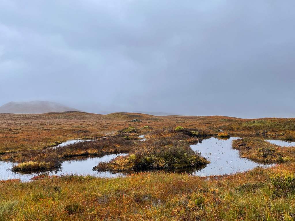 Nun sind es noch locker fünf Kilometer bis man im Rannoch Moor steht… geht… nein, man rennt. Die weitere Wanderung wird nämlich zu einer echten Herausforderung. Die offene Fläche des Moors ist dem Wetter total ausgesetzt, ein Ausweichen oder Schutzsuchen ist nicht möglich. Man muss durch. Aus Regen wird Schneeregen, dann Hagel, dann wieder Regen. Das Laufen auf den unebenen, kantigen Steinen ist anstrengend, flache Wegabschnitte sind überflutet. Meine Füße sind nass, meine Hände eiskalt. Einmal starte ich kurz den Versuch meinen Rucksack auf einem großen Felsen am Wegesrand zu parken, ich möchte meinen Mittagssnack aus dem Gepäck wühlen, sinke aber direkt bis zur Wade im Moor ein. War wohl nichts.