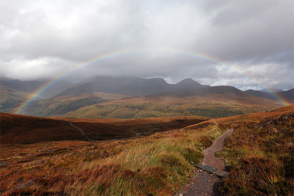 Der Regen peitscht mir frontal ins Gesicht, ich sehe nur noch was sich im Umkreis meiner Kapuze befindet. Ich schmeisse also wieder den Motor an und rase den sich mit Wasser füllenden Pfad bergab ins Tal. Ab und an wieder schneller als der Regen, hole ich auch kurz die Kamera raus, um die vielen aufploppenden Regenbögen für die Nachwelt festzuhalten. Der Weg nach Kinlochleven zieht sich, aber irgendwann komme ich an. Wie immer.