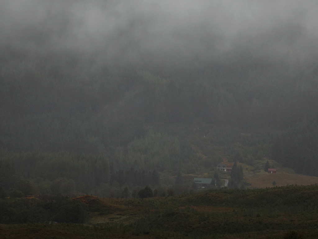 Man läuft also links durch ein Gatter, durchquert leider schon wieder gerodete Waldfläche (wieso hier gerodet wird, weiß ich allerdings nicht) und wandert dann erst mal auf den kleinen Hügel Mam Carraig von dem aus man eine grandiose Sicht auf den See Tulla Loch hat. Kurz nach Inveroran (das aus einem Hotel und einem Haus besteht), hört es sogar mal kurz auf zu regnen. Ich hole die Kamera raus. Keiner macht ein Foto von mir. Es ist niemand da. Sind alle schon weg oder starten heute von Tyndrum. Die Verrückten.